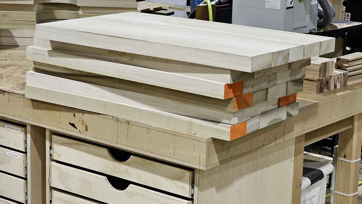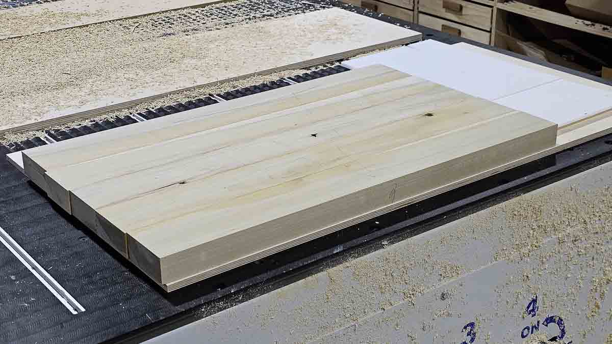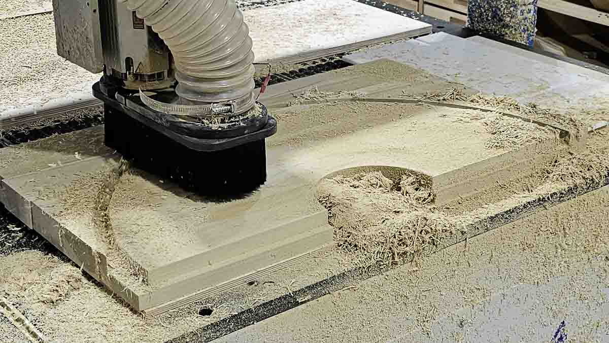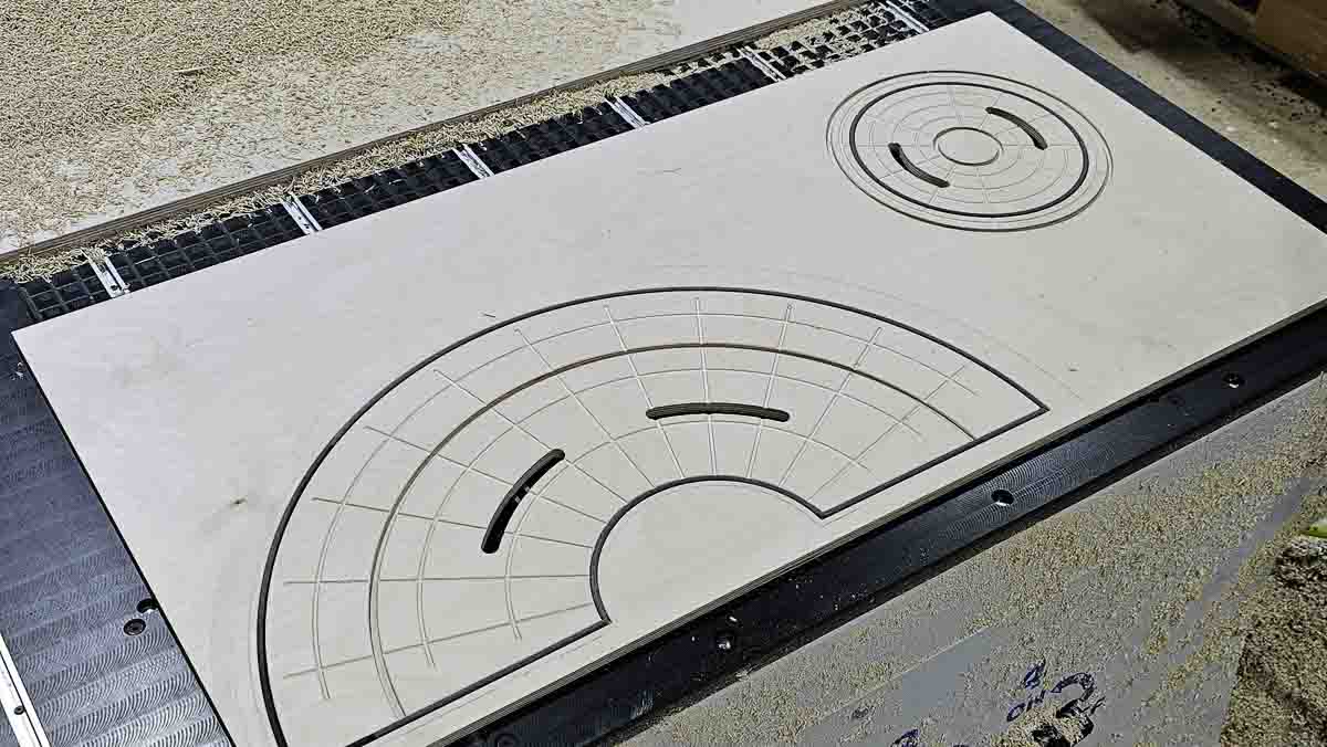 This is the vacuum fixture which holds the blanks during routing. The black lines are vacuum gaskets. The left side will hold the large base blanks and the right side will hold the small base blanks. Due to the size, there is 1000 lbs. or more of downforce on the large blanks from the vacuum.